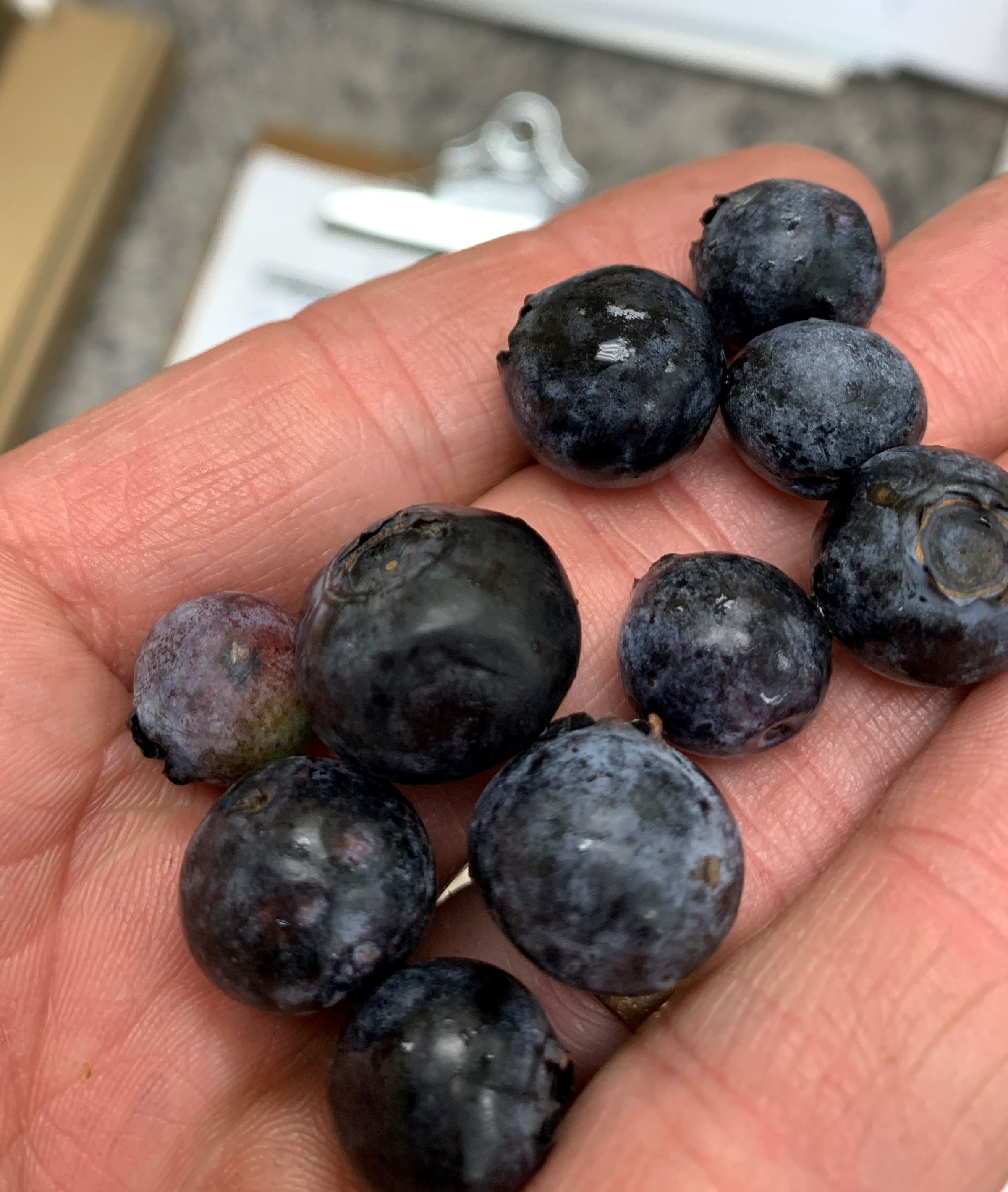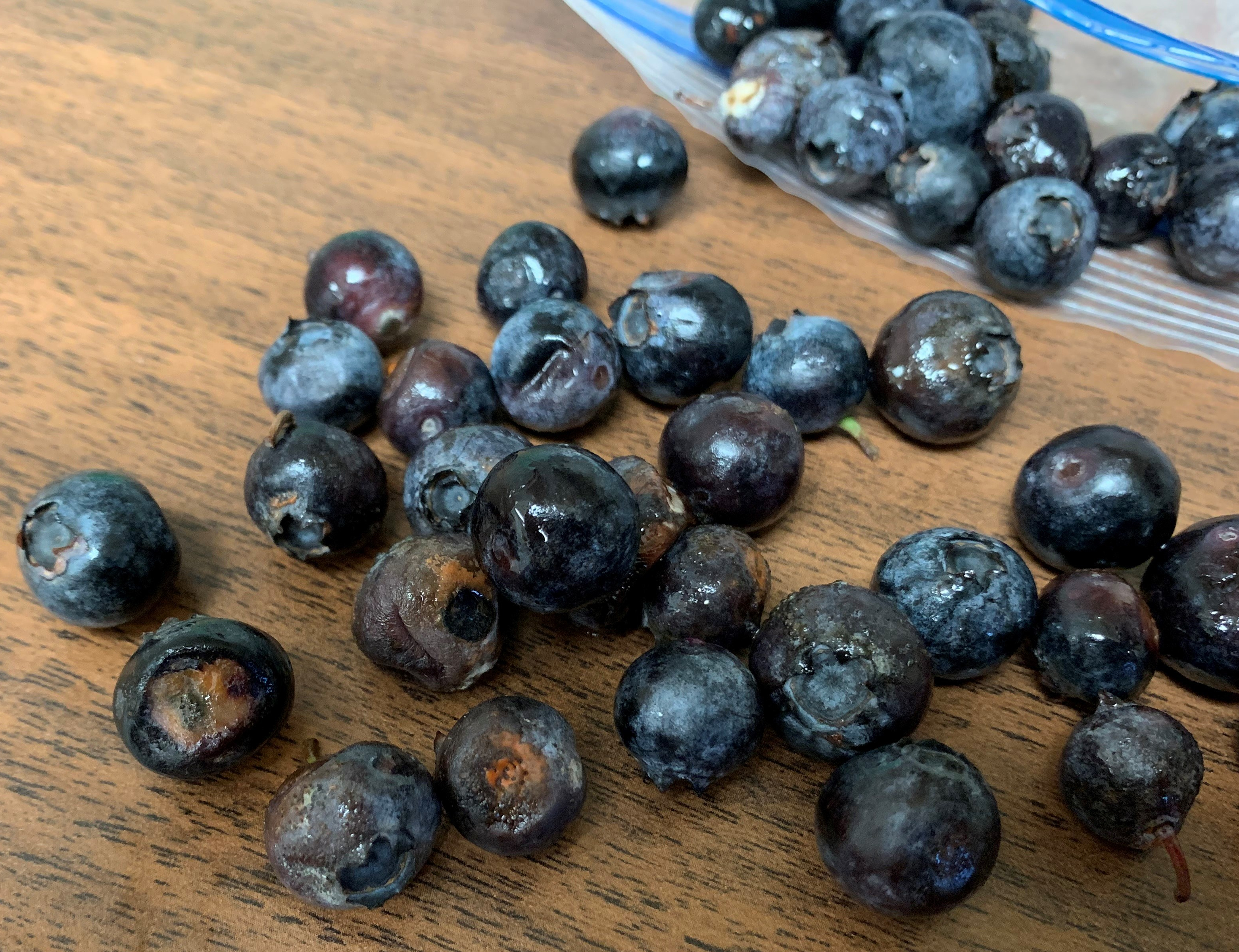 Anthracnose in blueberries. The photo on the right shows berries that were just picked. The berries on the left were picked 3 days prior to the photo being taken and stored at room temperature. You can see the orange spore masses on some of the berries. Photos from Zack Snipes.