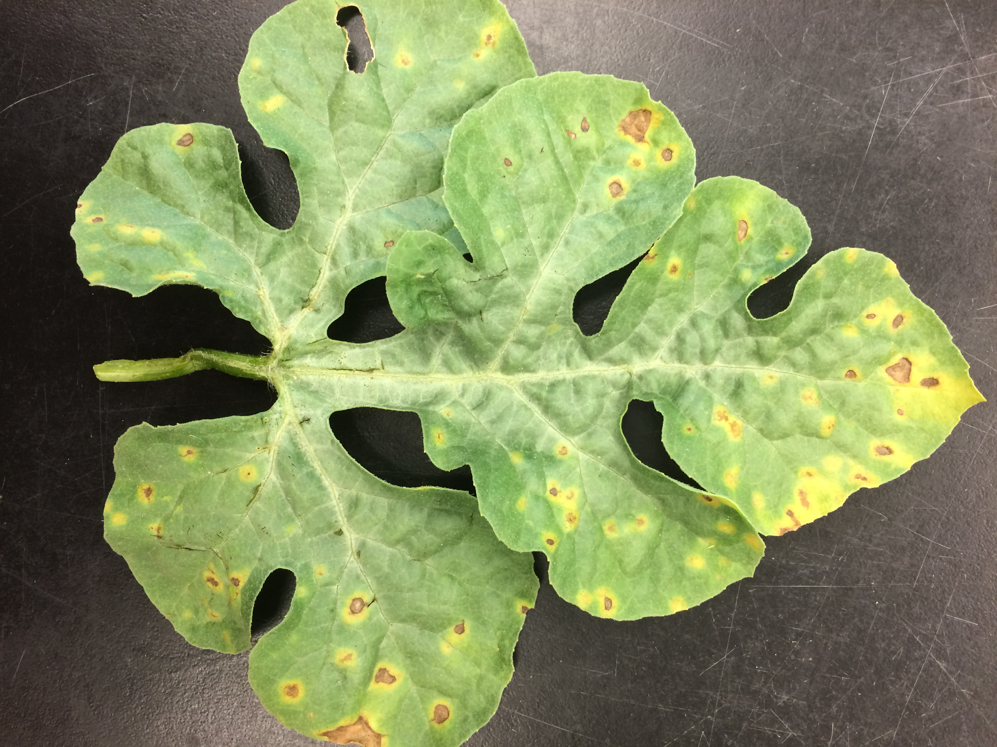 Dr. Tony Keinath reports,”Powdery mildew was found on watermelon at the Coastal REC on May 30. Typical symptoms of powdery mildew on watermelon are distinct yellow spots, although the spots may be indistinct yellow blotches rather than round spots. The symptoms seen this week included more browning than is typical for the size of the spots, perhaps due to unusually hot weather. To manage powdery mildew on watermelon and other cucurbits, click here. Powdery mildew-resistant cultivars of cucumber and cantaloupe are holding up well, but squashes with partial resistance to powdery mildew should be sprayed.”