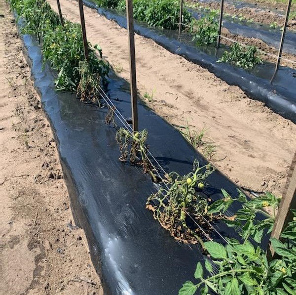 Tony Melton reports, “Seeing 2,4-D damage on tomatoes including a high tunnel plants near harvest, a high tunnel with transplants, and a field with plants setting fruit. Also seeing Roundup damage in a field of tomatoes and a greenhouse with thousands of many types of transplants (sprayed under beds). We’ve seen hail damage on a strawberry field, and plastic destroyed on a high tunnel. Curbit damage on 50 acres of pickles. Planting too shallow and too much irrigation. Starting to harvest fresh market cabbage and processing collards. Pickle plants starting to run, flower, and get sprayed for belly rot. Spraying peas, beans, and cucumbers for thrips.”