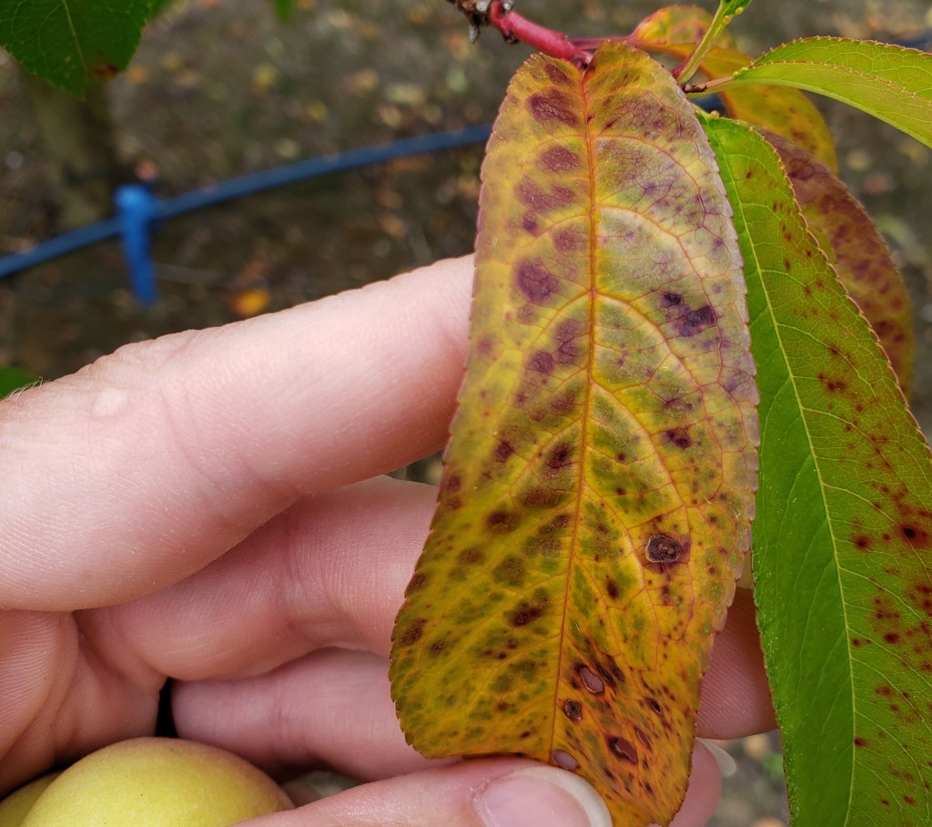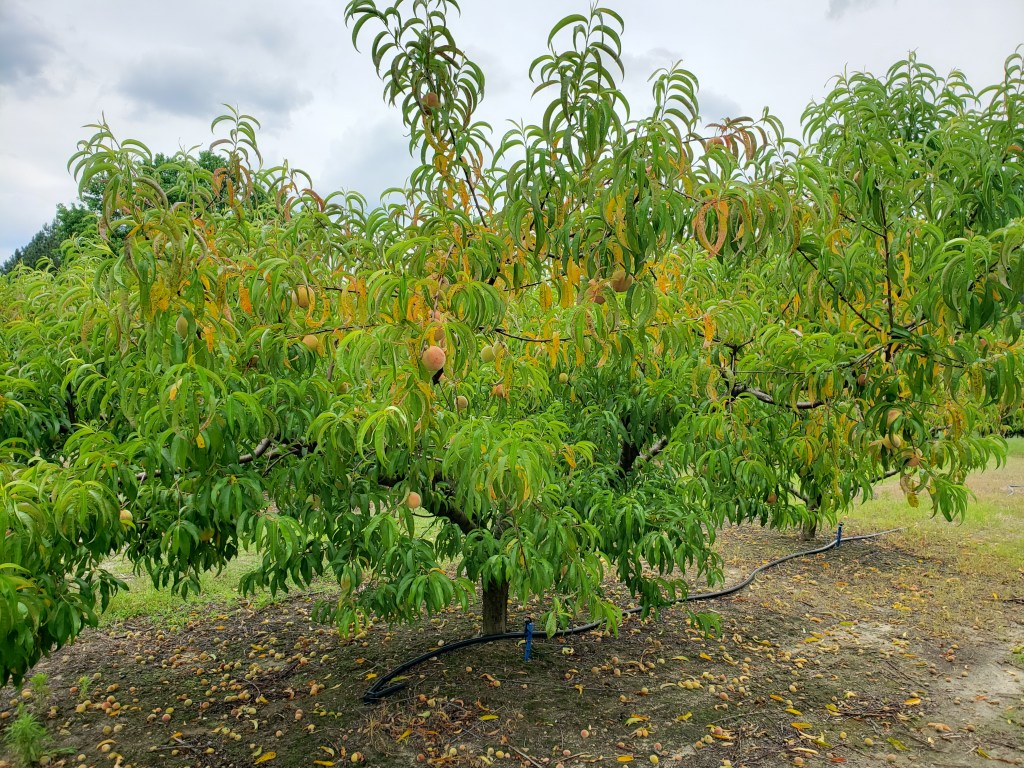 Sarah Scott reports, “We are in full swing with early variety peach harvest. Some peaches are developing a little smaller in size partly due to previous cold weather events. Something spotted in the field has been some nutrient deficiency. Growers may have been tempted to dial down nitrogen or calcium nitrate applications on peach blocks that suffered cold damage as they thought those blocks would not produce a viable harvest, however this could lead to leaf drop and less reserves for next year’s crop. If you skipped out on some of your fertilization keep in mind yellowing, spotting and leaf drop could occur. A soil application of calcium nitrate at 30lb/acre now and another in late July can help those trees recover some foliage and build up a nutrient supply for next year’s reserve. Be careful if you want a quick result and try foliar applications, as this could burn the leaves and cause more drop that you may not be able to afford.”