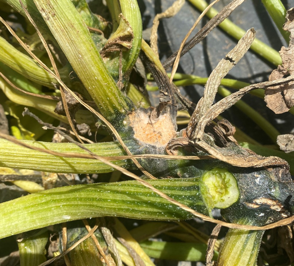 Andy Rollins reports, “We are having thrips issues on 3 crops peaches, pepper and cucumber. Thrips as seen in the picture cause surface damage to the outside make it aesthetically less appealing and marketable. On pepper they damage the leaves and can transmit viruses to the plant (on cucumber also). They are much worse in greenhouse and high-tunnel settings. I have been recently concerned about presence of chili thrips and I am waiting on definite identification. This is a good website about this new pest. I also found a rare disease called foot rot of squash in the upstate. It was identified by Dr. Tony Keinath. Rotation is very important with all of our vegetable crops. We are picking some excellent quality peaches in the upstate. Cold damage has limited our wholesale picking.”