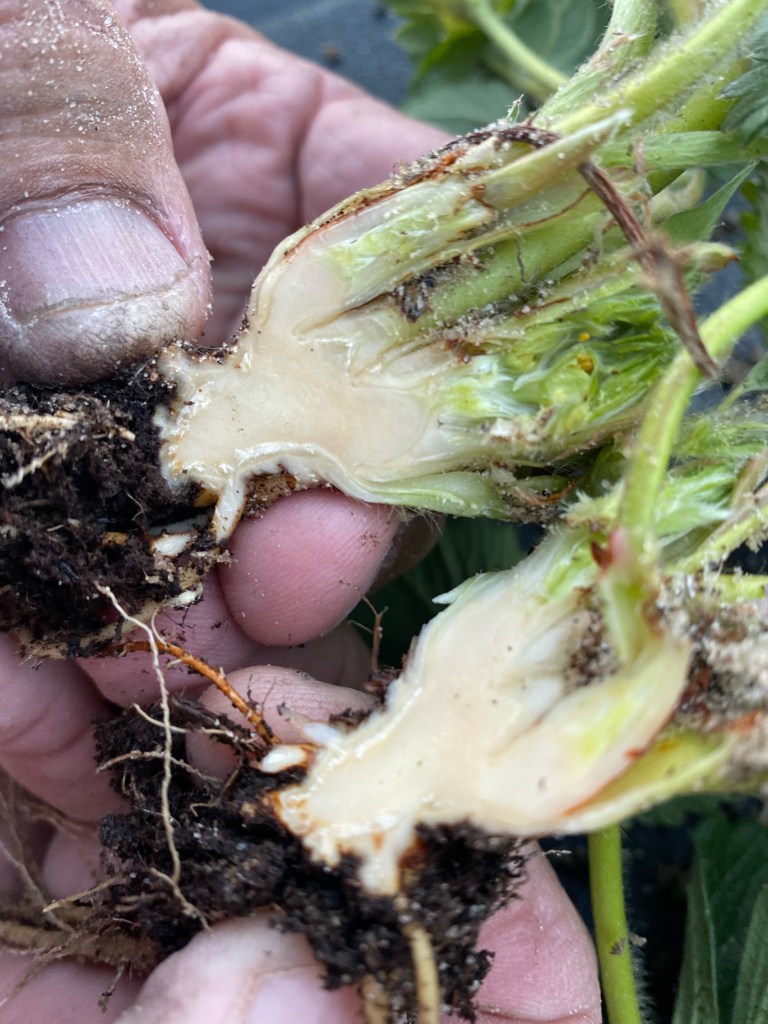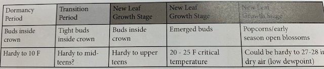 Andy Rollins reports, “Strawberry crowns can be damaged by 18 degrees Fahrenheit. Thankfully the crown pictured below was not damaged even though the field hit 18 degrees. Top growing points are damaged and un-opened flower buds as well. As a rule of thumb. If you have a row cover it should be put on when you believe these temperatures will be met. Flowers die at 30 degrees. And need to be protected as well but that is too early for us to. If you cover please make sure you uncover when temperatures rise up into 60s. Otherwise, you will force out all of your blooms. Dead blooms and leaves are there from warm spells earlier this winter. Rovral is an excellent choice for botryis crown rot but needs to be used before plants go into bloom. We are also pruning and planting peach trees getting ready for a new year. Oil sprays are better applied after prunning if possible.”