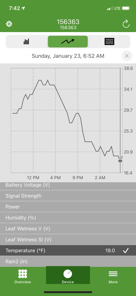 Zack Snipes reports, “One of our weather stations in Mt. Pleasant got down to 19F on Saturday night. Last Thursday our high was 73F and 55 hours later it was 23F. That swing in temperatures can definitely hurt plants as they aren’t as acclimated to the cold when it hits. Our strawberries should be fine as our temperatures did not get into the low teens or single digits along the coast. Time will tell how our brassicas fared in the cold temperatures.”