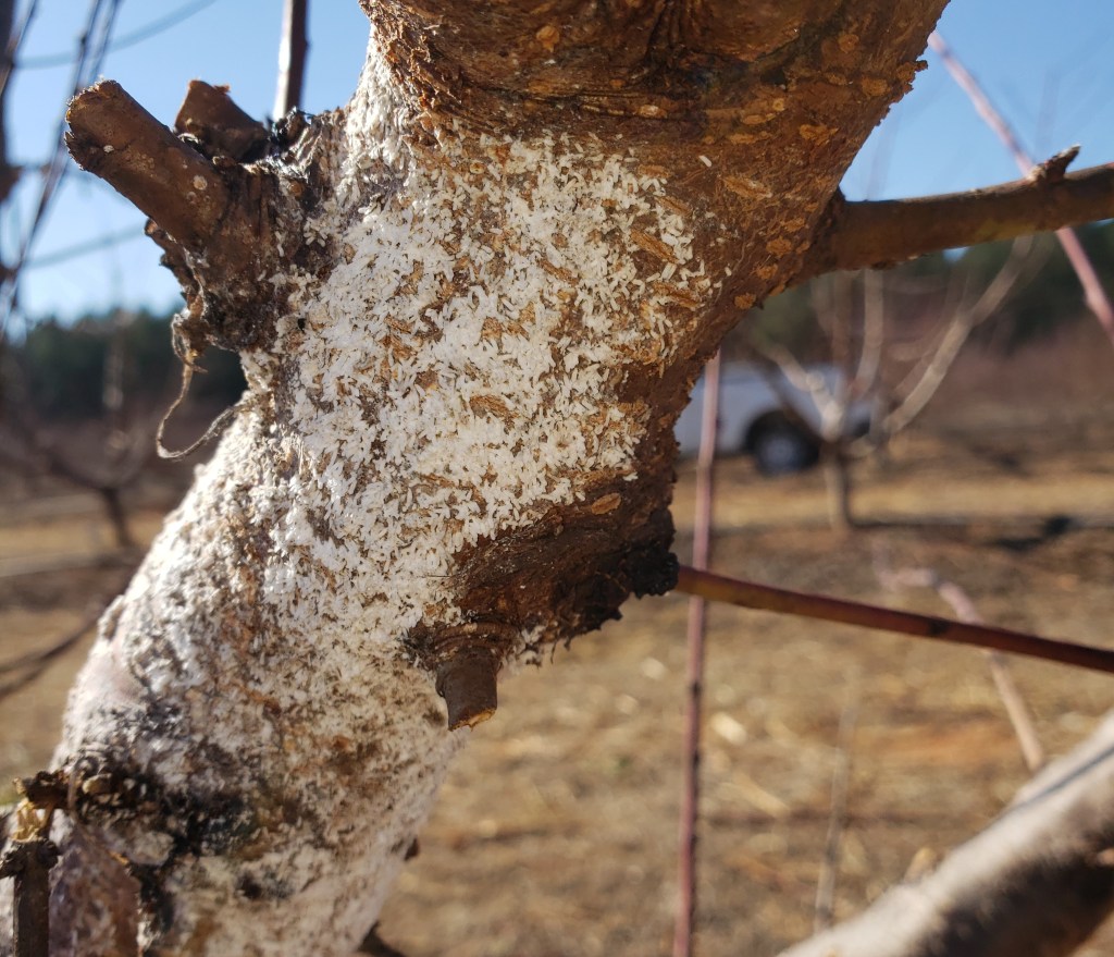 Sarah Scott reports, “Peach pruning and tree planting is still going on here in the ridge.  This week a grower spotted some white peach scale on a single branch in his orchard.  White peach scale usually isn’t widespread and isolates to one or just a couple of trees. It has been spotted more this winter than in the past so growers should be on the lookout. Regular dormant oil applications should take care of the population or spot treat.”