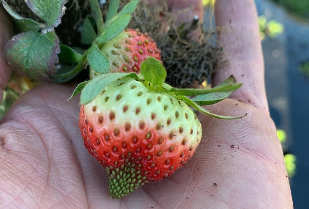 Example of a “bullnose” strawberry seen when boron is not applied this time of year. Photo from Zack Snipes.