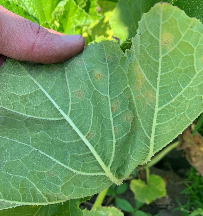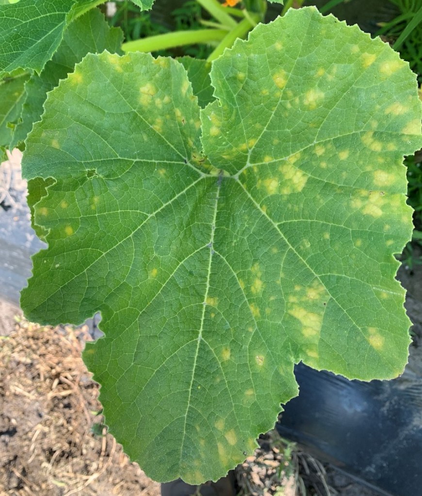 This year there have been several calls about powdery mildew on squash that looks like downy mildew. By “looks like” I mean small, yellow flecks on the upper surface and a tan spot underneath. It’s possible that the heat and sunny days have suppressed powdery mildew growth on the upper leaf surface.