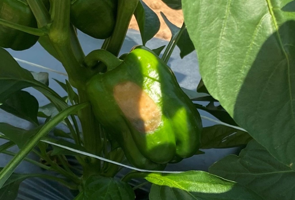 Andy Rollins reports, “This past week I have seen damage from the excessive heat/solar radiation to multiple crops across 3 counties in the upstate including blackberry, pepper, tomato, and squash. I have seen damage to the fruit as well as the plants themselves. During times of extreme heat, it is important to manage watering by increasing irrigation events more than just increasing the length of each watering. Pulse-type irrigation causes water to spread out better to reach more of the root system. Double drip tape (running 2 drip lines per bed) is very helpful in alleviating this problem even though the cost of the tape would double. You can reduce emitter output to half of what you are currently using and still put out the same quantity of water over the same period of time if keeping pressure constant. This allows for the same run time, just better water distribution. The blossom end rot shown on pepper (pic) is not directly caused by sun damage. During times of extreme heat stress, the plants can’t move calcium through the roots up into the plant, resulting in the damage shown. Better watering practices help the plants transpire and regulate their own temperature and nutrient movement more effectively, but under extreme conditions, may not completely eliminate the problem. Unlike tomato and pepper, the sun damage to the blackberry is from direct exposure and is only found on exposed fruit. The damage distribution to the peppers and tomato do not share this pattern.”