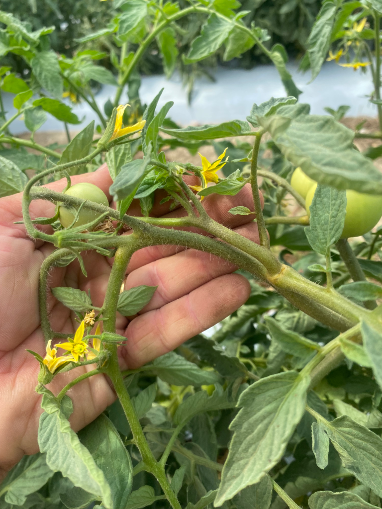 Andy Rollins reports, “This past week I identified a tomato pest that discolors the outermost stem tissue leaving a dingy darkened appearance. Smaller stems near blooms were collapsing and the grower was very concerned. At first I wasn’t able to identify in the field with a 10x hand lens. After bringing it back to office and observing under a dissecting microscope at 35-45x, I was able to see 1000s of a very small odd cigar shaped mites all along all of the stem tissue. After looking online, I was able to identify because of picture posted by Utah State University (https://pestadvisories.usu.edu/2021/07/21/tomato-russet-mites-spider-mites-tomato-spotted-wilt-virus-and-melon-aphids/). A good close up picture of the Tomato Russet Mite can be seen here. The hot dry weather has played a part in contributing to this problem. Dr. Tom Bilbo, Clemson Entomologist assisted with recommendations for control. The grower sprayed one of the recommended labeled miticides “Reaper” containing abamectin. Plants may need second application which can be made after 7 days and that will be assessed today for possible application tomorrow.
