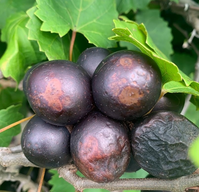 Zack Snipes reports, “Another wet week for us here in the Lowcountry. Some fields are drying out enough to get in and spray. A few growers have been lucky enough to miss some of the rains and have gotten in the fields to plant fall greens. Muscadines are really coming in right now. It seems that they are all coming in at the same time, which is not good news for U-pick and roadside stands. I am seeing a lot of ripe rot in the berries, particularly purple grapes. I am seeing it in scuppernongs but not as widespread as the muscadines. Symptoms of this diesase will be circular, sunken in lesions on the fruit. If allowed to incubate or under ideal conditions, salmon-colored spores will appear in the center of the fruit. This is the same disease we call anthracnose in strawberry, tomato, and watermelon. Our wet August has significantly contributed to this disease. At this point in the season, there isn’t much that can be done. Removing dropped berries and leaf litter will help with management for next season.”
