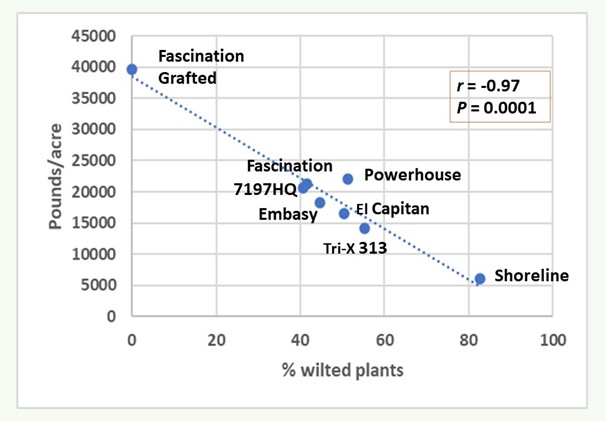 - Growers can expect similar yields from these cultivars planted into their fields infested with Fusarium wilt because the results were similar between the two years in this study. The test field is heavily infested with Fusarium, so yields in growers’ fields not as heavily or uniformly infested may be better.
