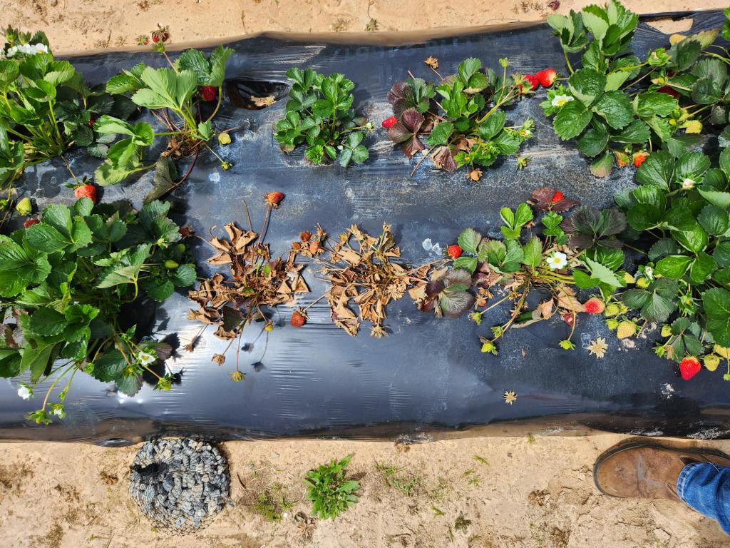 When you see a plant dying back like this, pull up the crown and carefully cut it in half to see if there is discoloration inside. These plants can also be sent to Clemson’s Plant and Pest Clinic for diagnosis. For information on management strategies, see the 2023 Strawberry IPM Guide or contact your local Extension Agent.