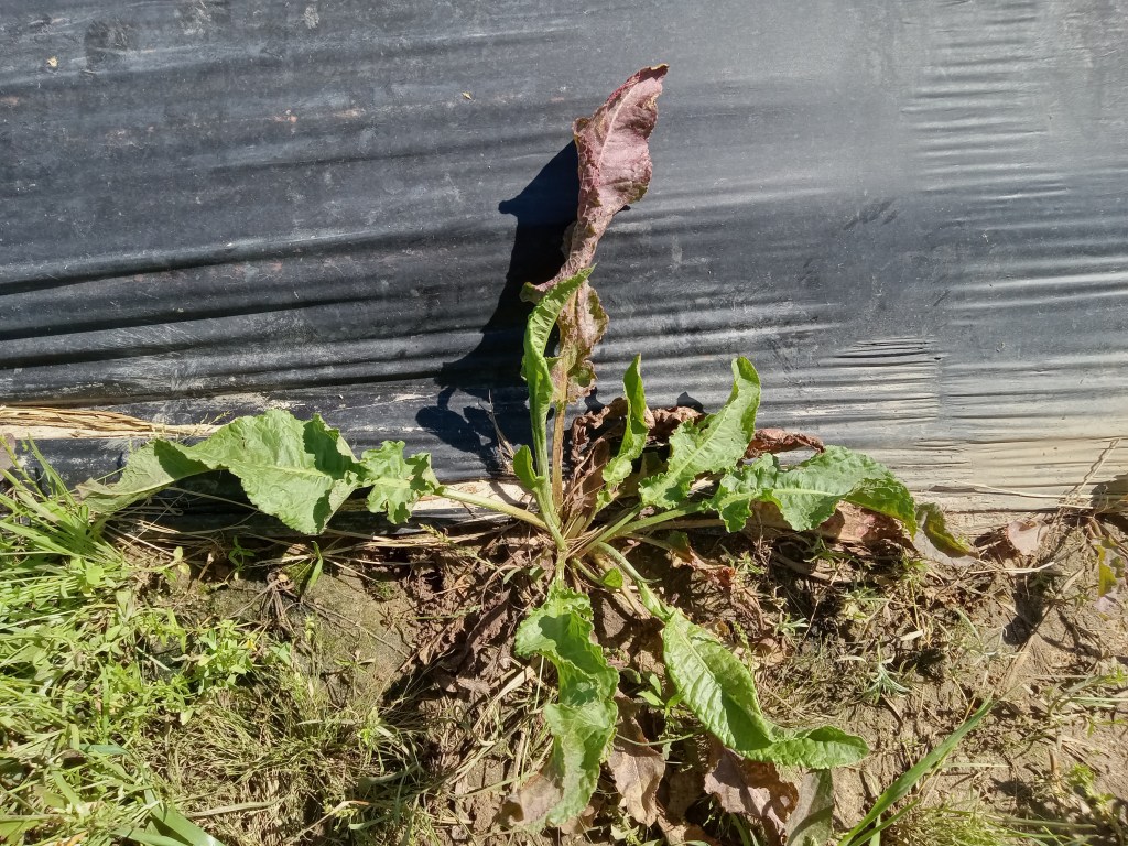 This is curly dock (Rumex crispus). Curly dock is a perennial weed that thrives in wet conditions but is also quite tolerant of drought. It is commonly found in the row middles in strawberry fields, especially in low areas that remain damp for extended periods. Once established, this is a pretty tough weed to get rid of. For management strategies, take a look at the weed management section (starting on page 63) of the 2023 Strawberry IPM guide.
