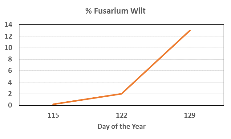Right on schedule, symptoms of Fusarium wilt appeared in most plots by 5 weeks after transplanting, May 9.