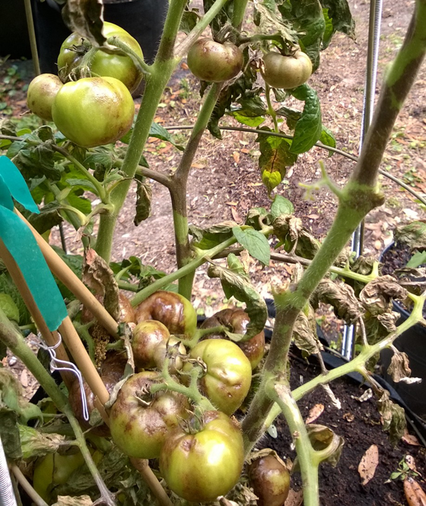 Over the past 30 years, every time I have found late blight on tomato in Charleston County has been after 3 days of temperatures in the low to mid 70s. Chlorothalonil is an excellent protectant against late blight. If late blight develops in tomato, use a rotation of two products listed in the tomato late blight section of the 2023 Southeastern Vegetable Crop Handbook on p. 300-301. Organic growers should use an organic-approved formulation of a copper fungicide.