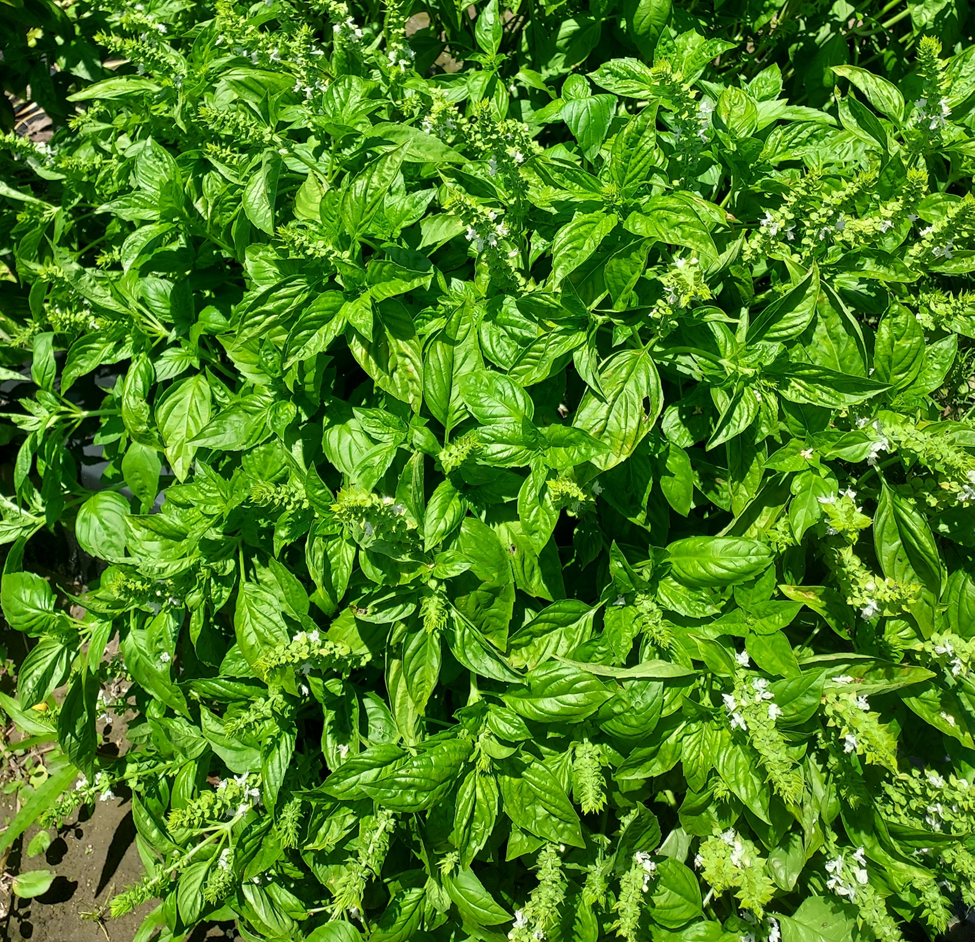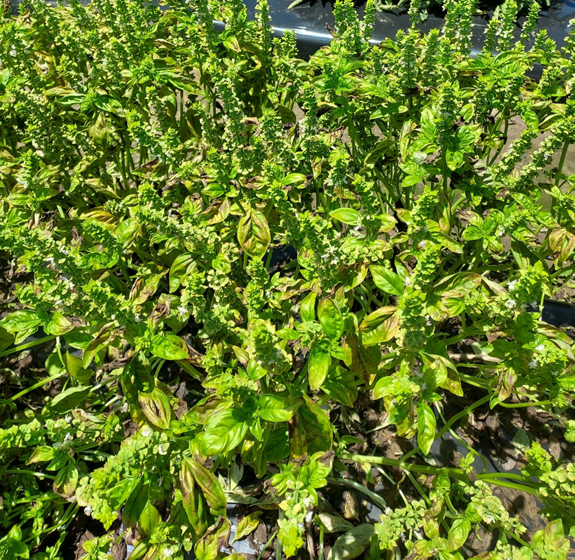 One of the rainstorms the week of June 5, 2023, brought basil downy mildew spores with it to Coastal REC. On Friday, June 9, all four cultivars in our demonstration were healthy and more than ready to harvest.