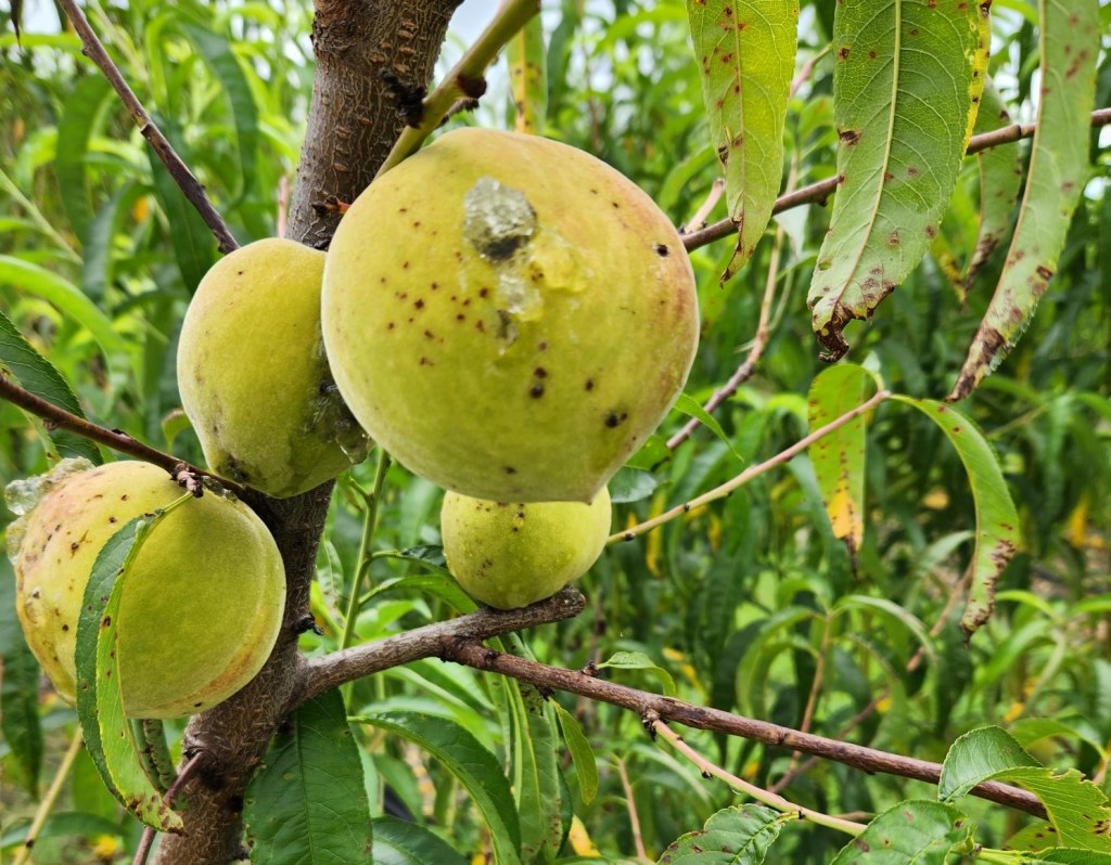 - Bacterial spot is an issue on fruit. Infections would have come in earlier in the season, but lesions tend to grow and show up close to harvest time. Jelly is another symptom that can occur.