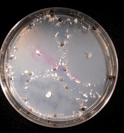 Sclerotinia infects plants in two different ways. Sclerotia can germinate like a seed, and then the fungus grows a short distance (an inch or two) to a nearby plant and attacks the stem. More likely, freezing temperatures trigger sclerotia to produce tiny mushrooms that produce airborne spores. Traveling spores are why white mold can show up in fields with no history of the disease.
