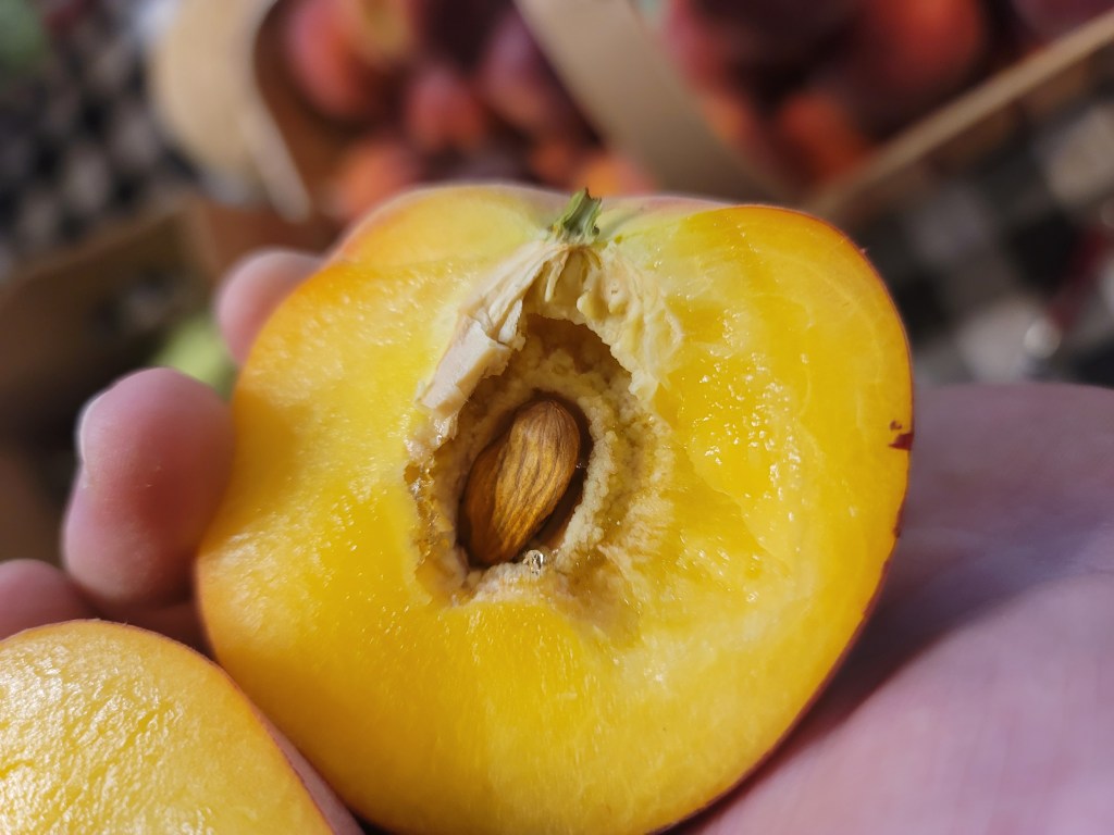 - The peach crop is heavy right now. Some varieties have split pits due to cold damage back in March. We thought we made it through those events ok, but as fruit is coming to harvest, we are finding much more split pits than anticipated. Although the cold damage does not really cause damage to the taste of the fruit, a split pit/dead seed can cause the shelf life of the fruit to drastically decrease. Hopefully, we will see much less of this damage as we get deeper into the season.