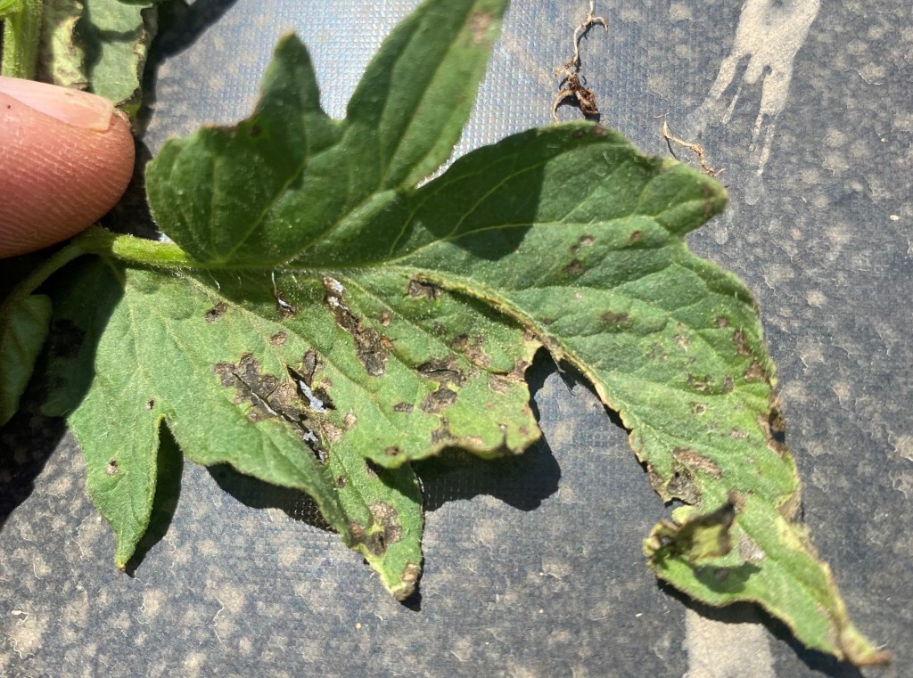 - Tomatoes are growing well around my area, but there is a rather alarming rate of Southern stem blight causing plant decline. In isolated areas, I have also seen bacterial speck, usually caused by irrigation over the top of the crop or prolonged dew on foliage in shady spots along field margins.