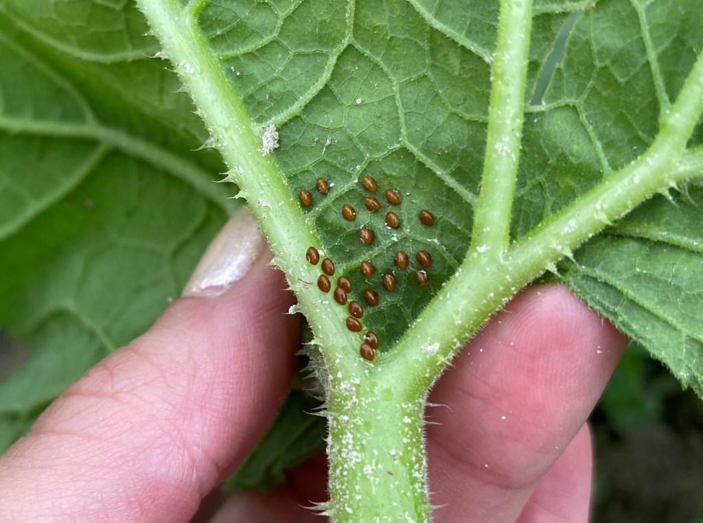 - Yellow summer squash is being harvested and looking delicious! Squash bug eggs have been spotted here and there, but not in high numbers yet. Look for bronze-colored eggs on the undersides on squash leaves when scouting for this pest.