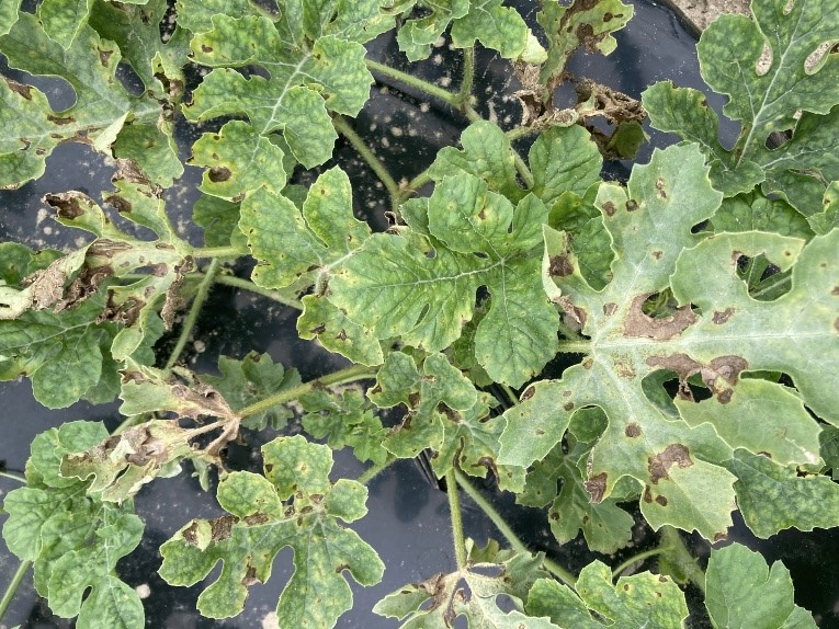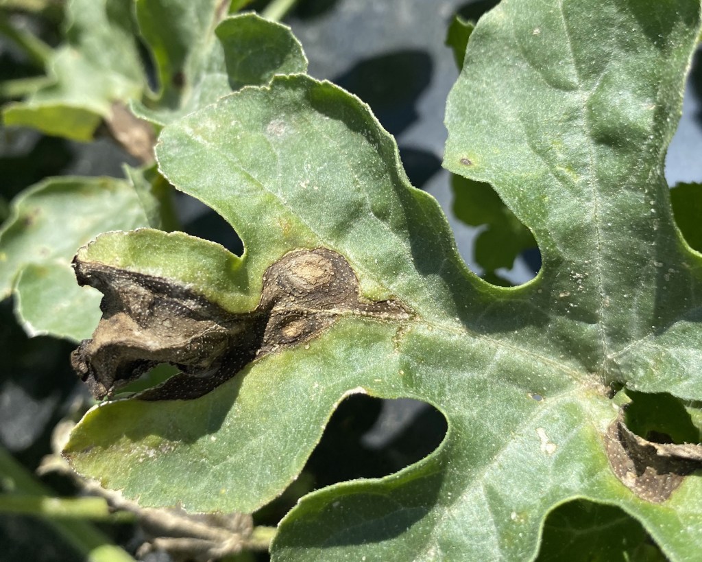 - Watermelons are growing nicely and the first fruits are sizing well. A few issues are showing themselves, mainly spider mites in and around the crowns of plants, scattered gummy stem blight, and some anthracnose.