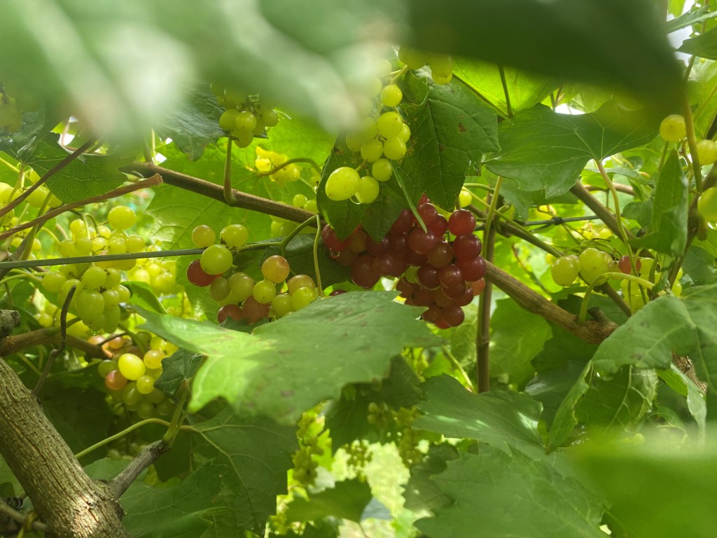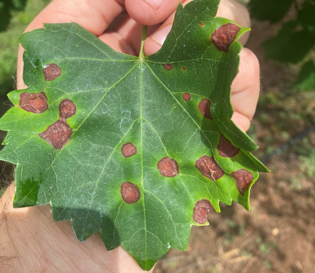 - Muscadine grapes are looking good in the upstate. Yields and crop quality look to be as good as last year or better. We are finding some black rot (Guignardia bidwellii f. muscadinii), but only leaf symptoms. Recent rains are requiring biweekly fungicide sprays to keep fruit protected, especially with moist conditions. Trial plants of Rhazzmatazz are beginning to ripen and will have to be picked over this week. This variety is a cross between muscadine and bunch grapes. The fruit often has 18-22% sugar although they are very small. This has been a great reminder that grape season isn’t far away.