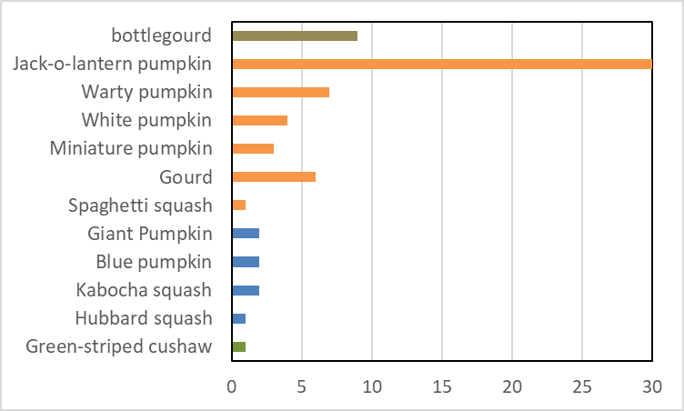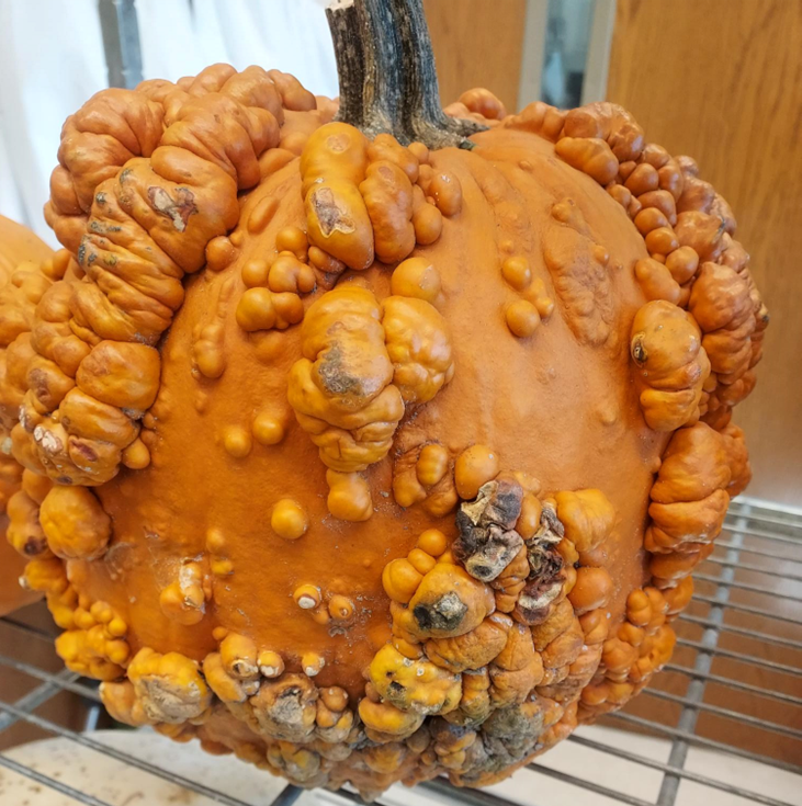 As part of a new grant on cucurbit anthracnose with the University of Georgia, we sampled 68 pumpkins, gourds, and winter squash from “cull piles” at 7 pumpkin patches and small farms in South Carolina in October, November, and December 2023. Two-thirds of the 10 types of cucurbits sampled were jack-o-lantern pumpkins (including new warty types), along with 4 types of gourds, 4 types of winter squashes, and a few giant pumpkins. Fruit were produced in South Carolina (36 fruit) and other states (North Carolina, Virginia, and New Mexico).