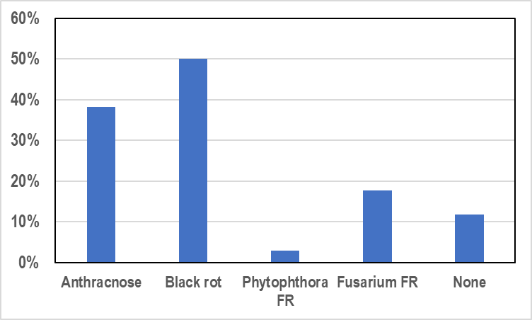 The symptoms on the fruit were quite variable, from small, dry, white flecks to large, soft, black spots. It was not possible to reliably classify the fruit rots based on symptoms, so we cultured fungi (and a water mold) out of the fruit in the lab. The graphs are based on recovery of pathogens from 60 fruit; 8 fruit had no pathogens.