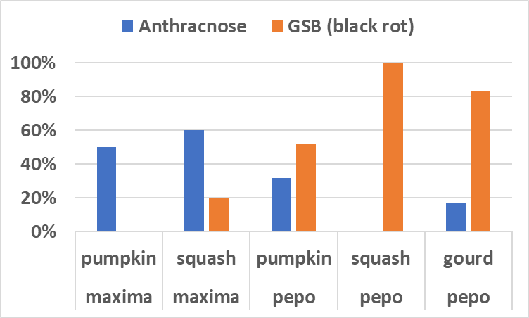 Growers of susceptible Cucurbita pepo crops, which include jack-o-lantern pumpkins, mini-pumpkins, miniature gourds, and spaghetti squash, should consider protecting fruit from black rot with fungicides recommended for gummy stem blight: one application at flowering and another when small (about 4-6 inch-long) fruit are set. Acorn squash, also in Cucurbita pepo, is not considered to be susceptible to black rot, although none was sampled in 2023.