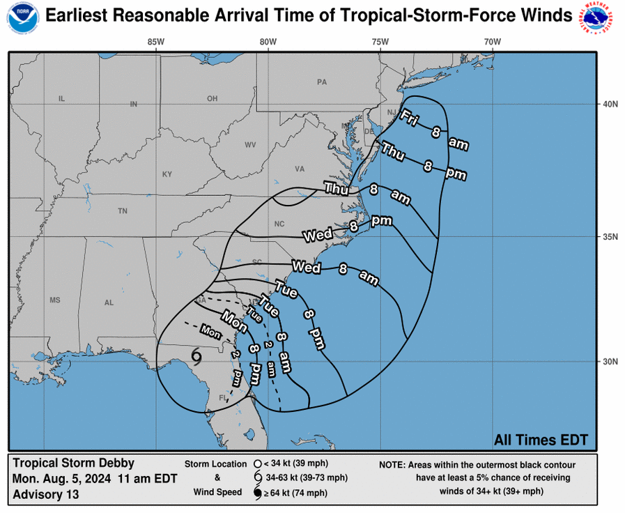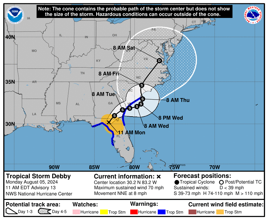 Tropical Storm Debby made landfall in Florida this morning as a category 1 hurricane and is expected to bring significant amounts of rain and winds to South Carolina this week. The latest forecast shows Debby making landfall near Georgetown, SC and traveling north through the Pee Dee region.