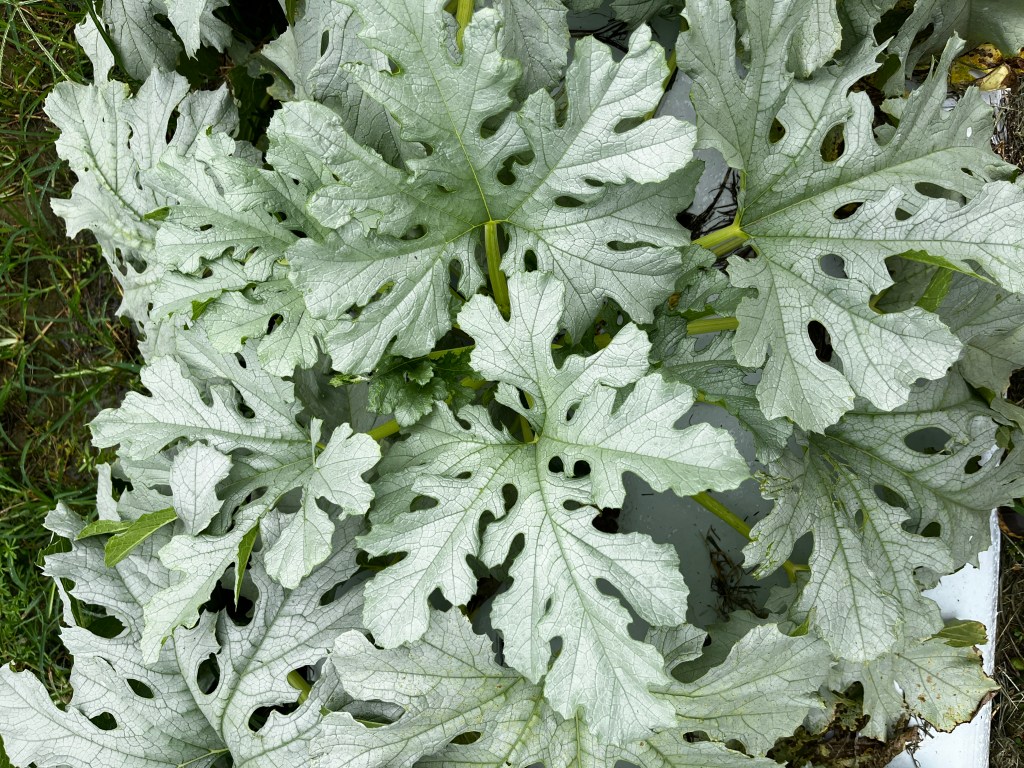 - Whiteflies: I’ve been seeing whitefly-induced leaf silvering which is NOT to be confused with either powdery mildew or some of the squash cultivars that naturally have some silver spots. Whitefly silvering tends to be more uniform across the entire leaf surface. The picture below is a severe case. Natural cultivar silvering manifests more as isolated angular blotches along the veins. Powdery mildew looks like white powdery spots. See more pictures comparing silvering here.
