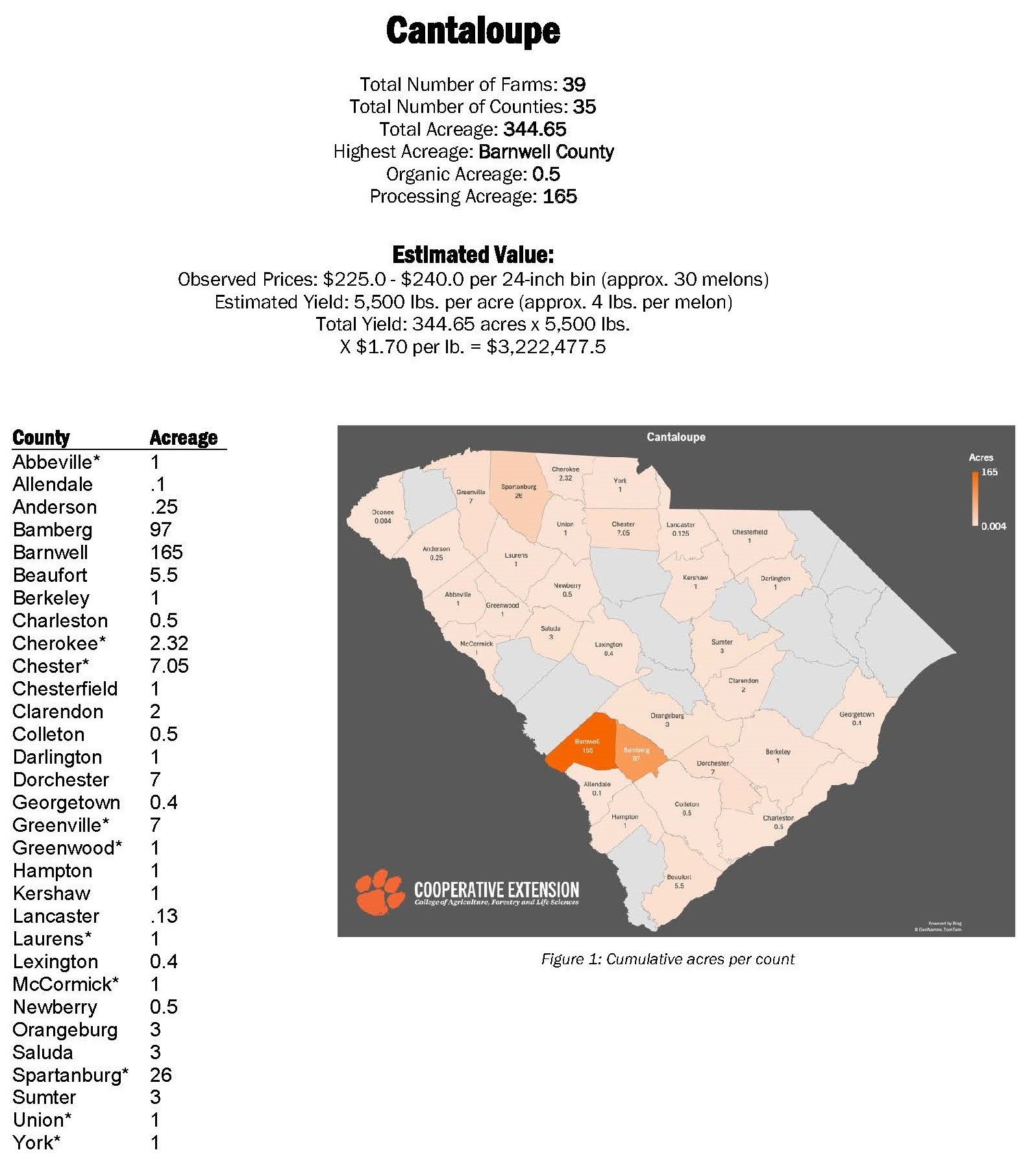 In fall of 2023, Extension Agents throughout South Carolina surveyed growers on specialty crop acreage for the year. The goal was to identify the counties of production, acreage, and observable market prices for the year. In this round of surveys, data was collected for 14 fruit and vegetable crops. Cantaloupe, green onions, and beefsteak tomatoes … Continue reading 2023 Crop Stats: Cantaloupe, Green Onions, Tomatoes(Beefsteak)