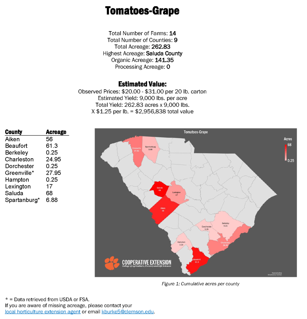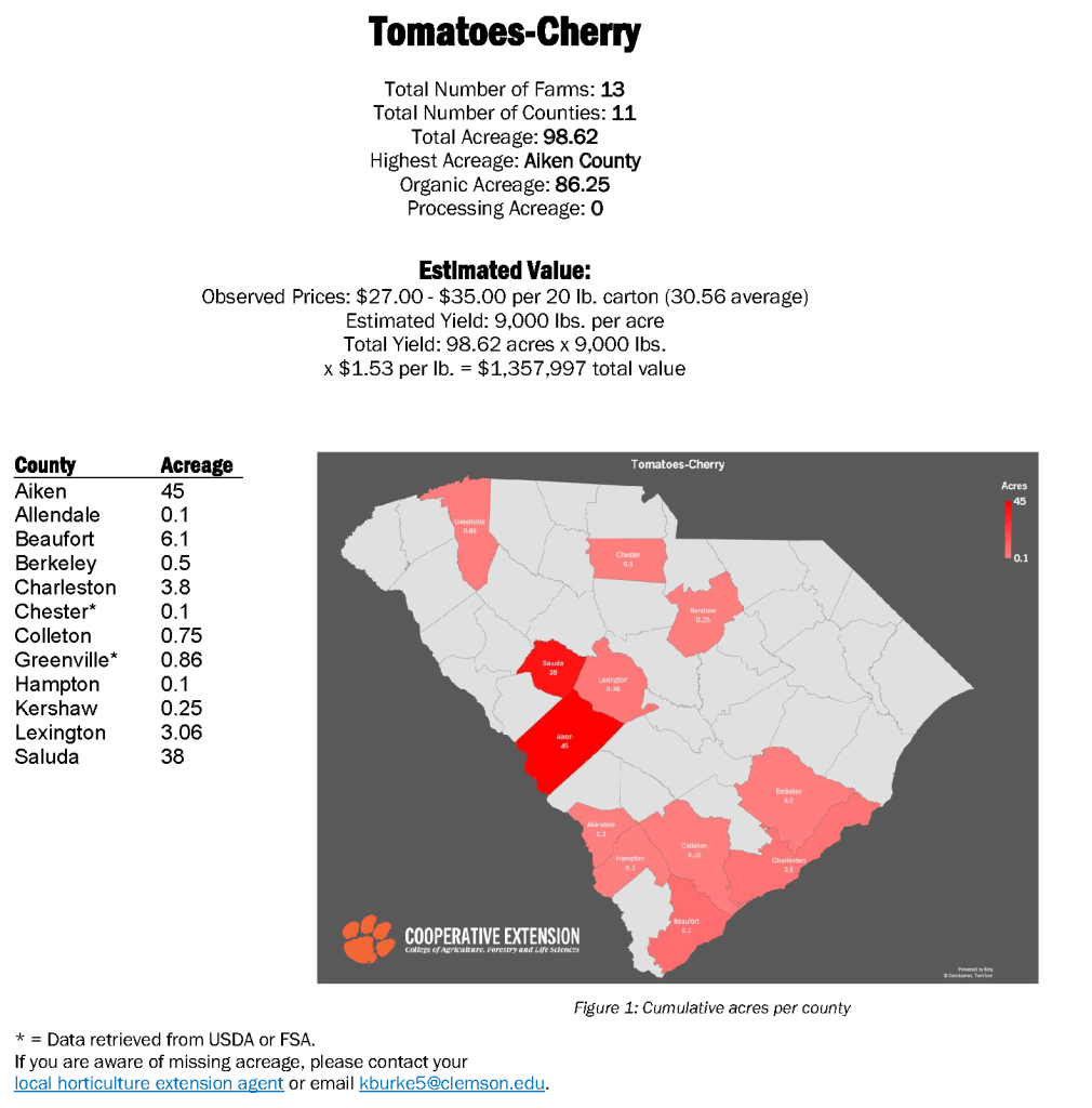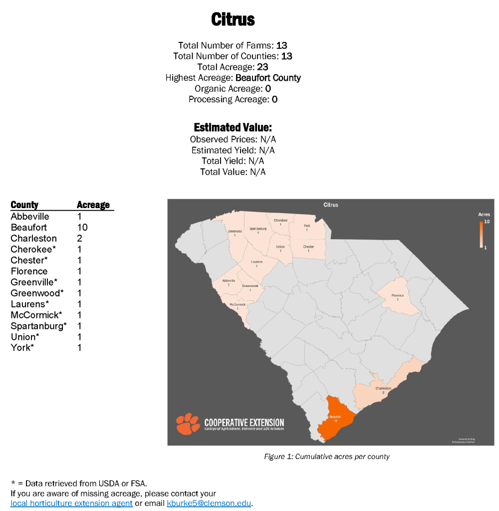 In fall of 2023, Extension Agents throughout South Carolina surveyed growers on specialty crop acreage for the year. The goal was to identify the counties of production, acreage, and observable market prices for the year. In this round of surveys, data was collected for 14 fruit and vegetable crops. Bulb onions, citrus, and grape and cherry tomatoes are listed below. See more crop stats on the Clemson Agribusiness page.