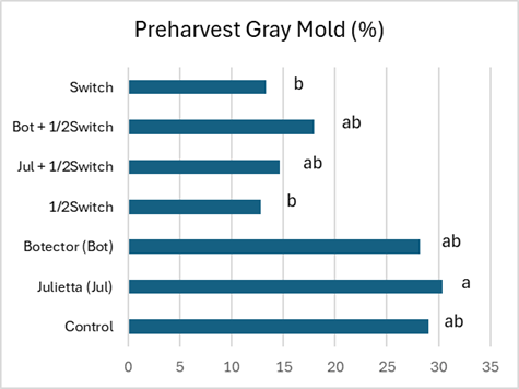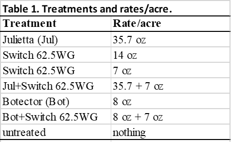 From experience and based on studies published by others we did not expect the two materials to perform nearly as well as the grower standard. Therefore, we combined the products with a reduced (half rate) of the grower standard (Switch) in hopes that the BCA and the synthetic fungicide standard would synergistically work as well as the grower standard (full rate of Switch). Preliminary lab studies indicated that the active ingredient of Switch (fludioxonil) had no adverse effect on Julietta but did inhibit Botector under controlled conditions. That was an interesting lab result because we concluded the combination of Julietta with Switch might work better for disease management compared to the combination of Botector with Switch.