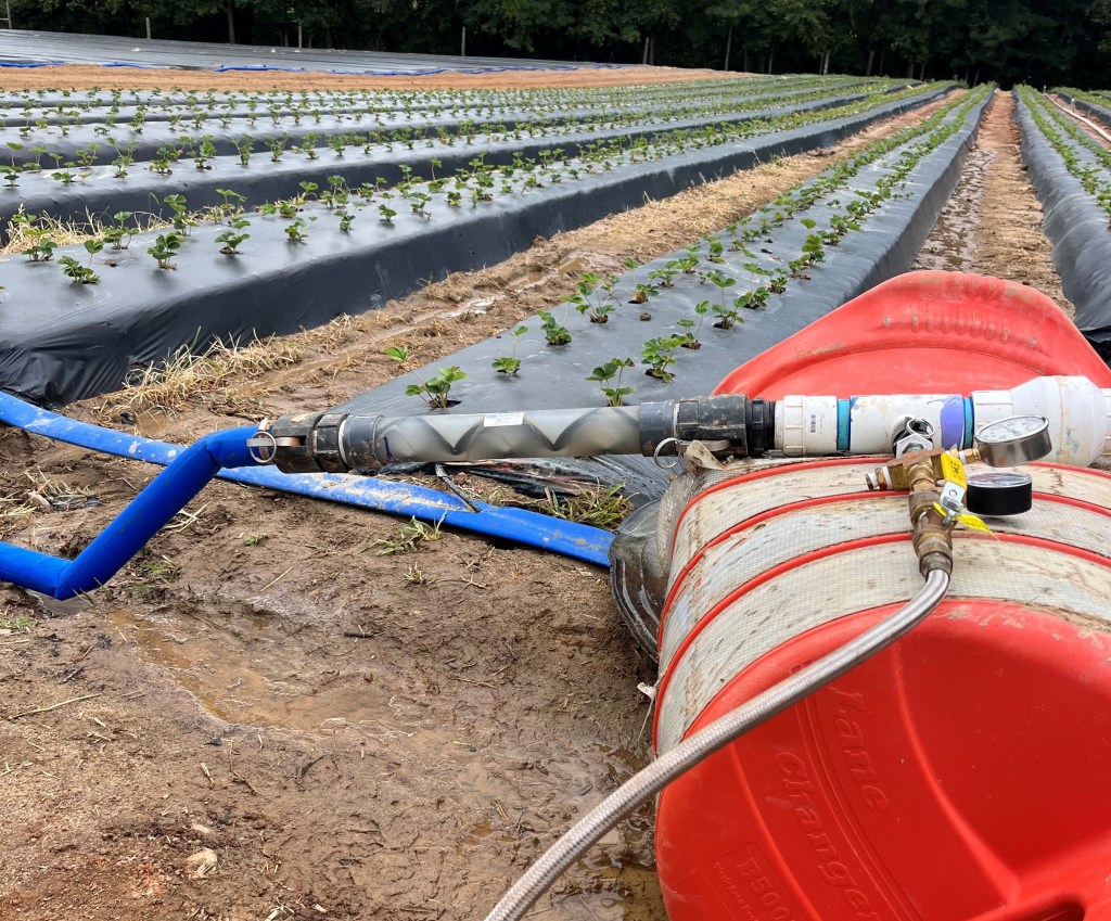 - I have been working on a project helping farmers learn a new way to fumigate the soil more safely and effectively. In the past, we have used shank-type fumigation that involves pulling a plastic bedding machine with injection shanks in the middle of the bed. The fumigant is carried on the tractor also and is run through those shanks. Using this method, the machine is picked up and put down at the end of every row and lifted in the air. Workers on the ground are often exposed to fumigant vapors from dripping lines. I am showing them how to put the gas into the drip system to allow the water to distribute it more efficiently. This is a closed system with much less risk of exposure. I have done on-farm demonstrations 3 times already this year (2 last week) and have 3 more left.