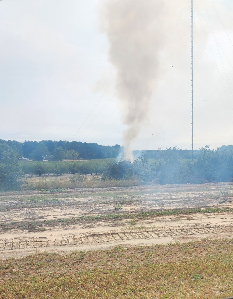 - Land is being prepped for new peach plantings. Trees are pushed up and burned in piles and fields are then plowed and raked to clean them up for winter planting.