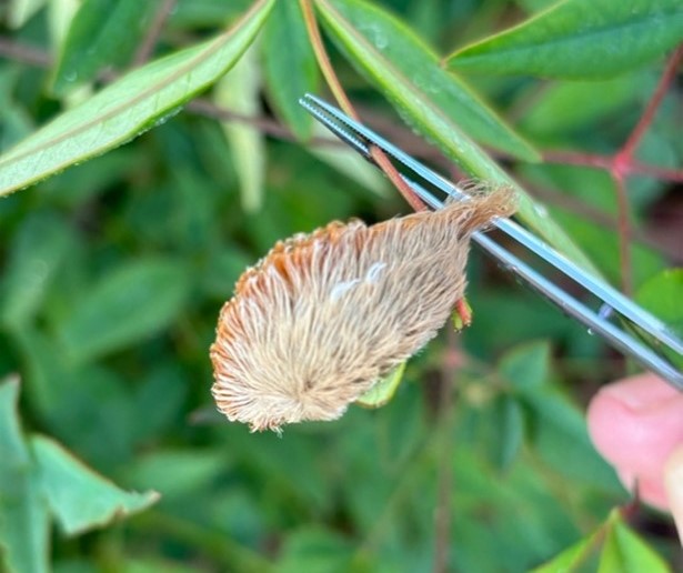 Maxing out at about 1 inch in length, puss caterpillars are the larval form of the Southern flannel moth. An attractive, brown furry moth. The moths are not venomous. While most common on oaks and elms, puss caterpillars may feed on over 41 genera of plants throughout the eastern US. The pictured caterpillar was found feeding on heavenly bamboo (Nandina), a common landscape shrub in Clemson, SC. As a plant pest, they are rarely abundant enough to require management but be on the lookout when doing landscape work to avoid a painful encounter. Read more about the puss caterpillar here.