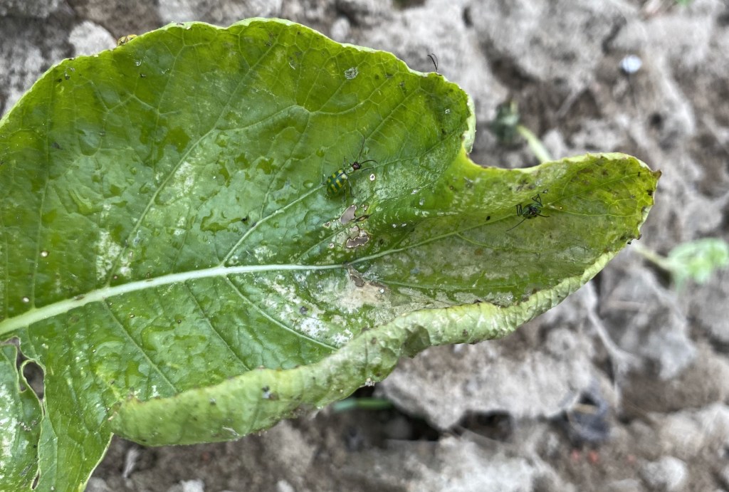 - I did notice some leaf spots on cabbage last week, possibly from sand-blasting, along with a large population of banded cucumber beetles on collards.