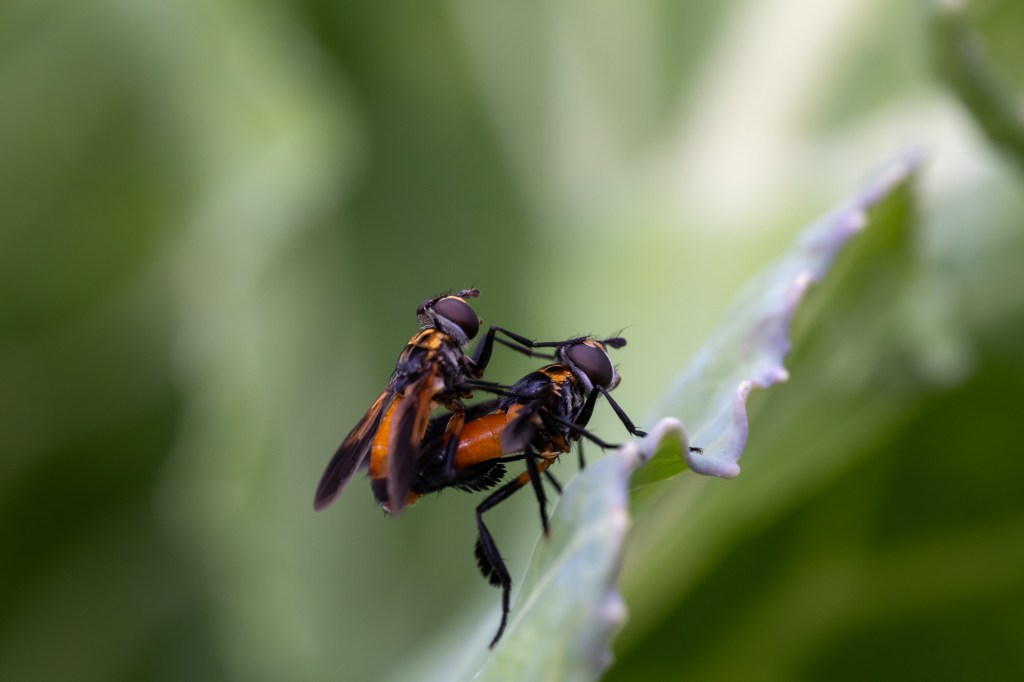 The oblong, white objects on this leaffooted bug (Leptoglossus oppositus) are eggs of a parasitoid fly (Trichopoda pennipes), which will hatch and consume the leaffooted bug. Usually when we discuss parasitoids in pest management we are referring to small wasps, but flies in the family Tachinidae also parasitize other insects and can be beneficial in pest management. This fly genus is sometimes referred to as “feather-legged flies” because their back legs have feather-like hairs sticking out. This fly will parasitize squash bugs and other related stink bug and leaffooted bugs.