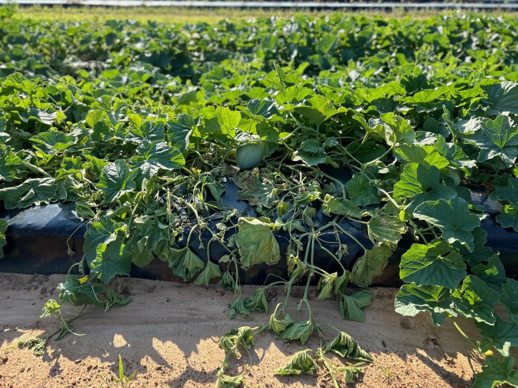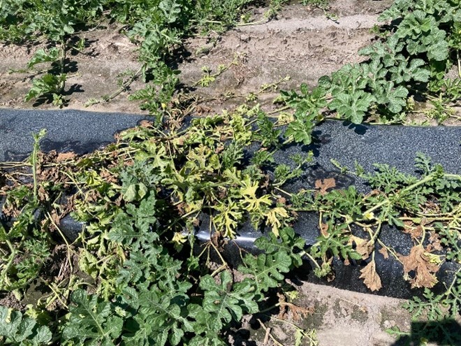 - One cantaloupe field had several plants that mysteriously declined, seemingly overnight. Insect pressure was insignificant and there were no obvious disease symptoms to which the decline could be attributed to, so samples were sent for diagnosis.