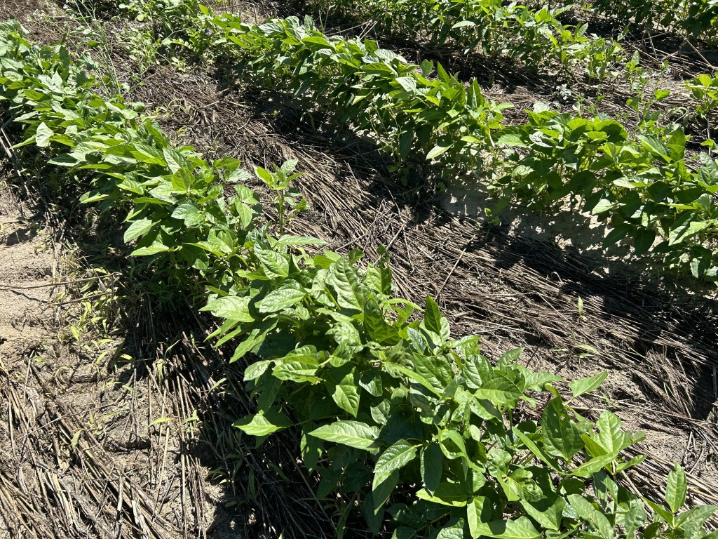 - Peas and butterbeans are progressing well. I have seen some thrips damage on leaves, mainly at the edges of fields, but other than that, there are no major issues. It would be a good time to get control of the thrips before flowering where populations are high.