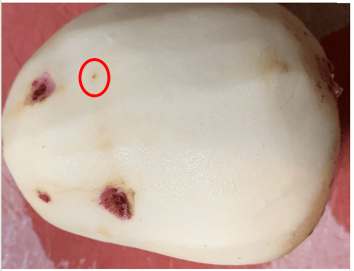 If the skin is scrubbed off a tuber with expanded lenticels, small, shallow, brown spots may be visible on the flesh. In 98% of the cases, these spots are removed during peeling. Deeper spots may need to be removed with the tip of a paring knife.