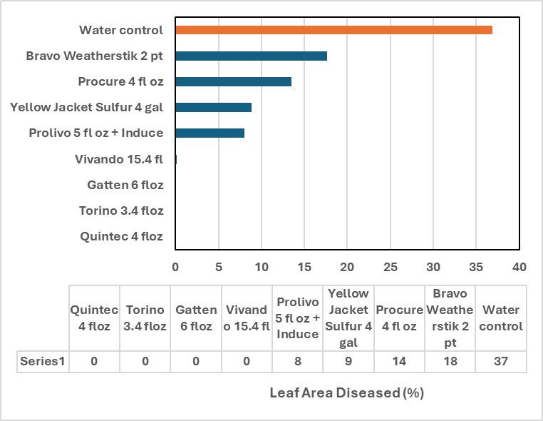 Bravo and sulfur, an organic option, are contact fungicides that remain on the leaf surface. They did not control powdery mildew on the lower leaf surface (data not shown), which is one reason they ended up in the less effective group.