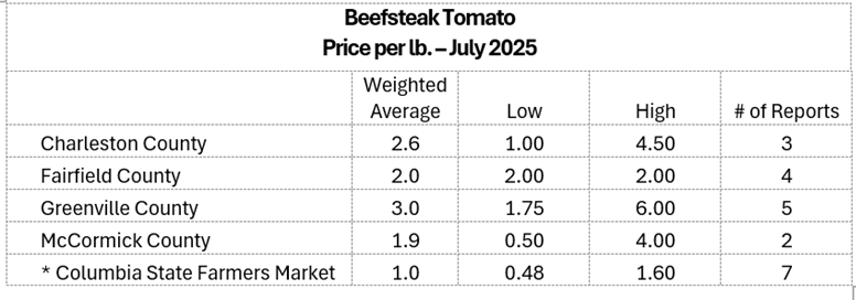To briefly summarize, in total we received 14 reports of tomato prices through the month of July. These were reported from Charleston (3), Fairfield (4), Greenville (5), and McCormick (2) counties. We are also including data on the 7 times tomatoes were reported from the South Carolina State Farmers Market in Columbia. Only low and high prices were reported without regard to variety, appearance, size, or other characteristics. On a per pound basis, the range of prices was from $0.48 per lb. all the way up to $6.00 per lb. Greenville County had the highest average of all counties at $3.00 per lb. This most certainly does not cover the entire state but provides some perspective on prices in regions of South Carolina throughout the month.
