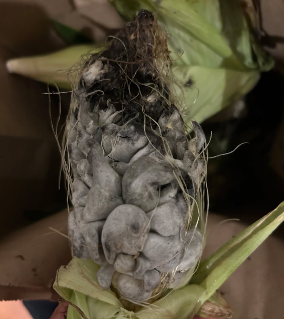 Corn smut (Ustilago maydis) is quite the unattractive name for a very delicious fungus. In my opinion, a more fitting and fancier name is given to the delicacy in Hispanic cultures—huitlacoche or Mexican truffle. The fungus overwinters in the soil and infects corn ears via the silk. The fungus then causes the plant cells to multiply and creates a grayish-white soft mass. The mass is jet black on the inside.