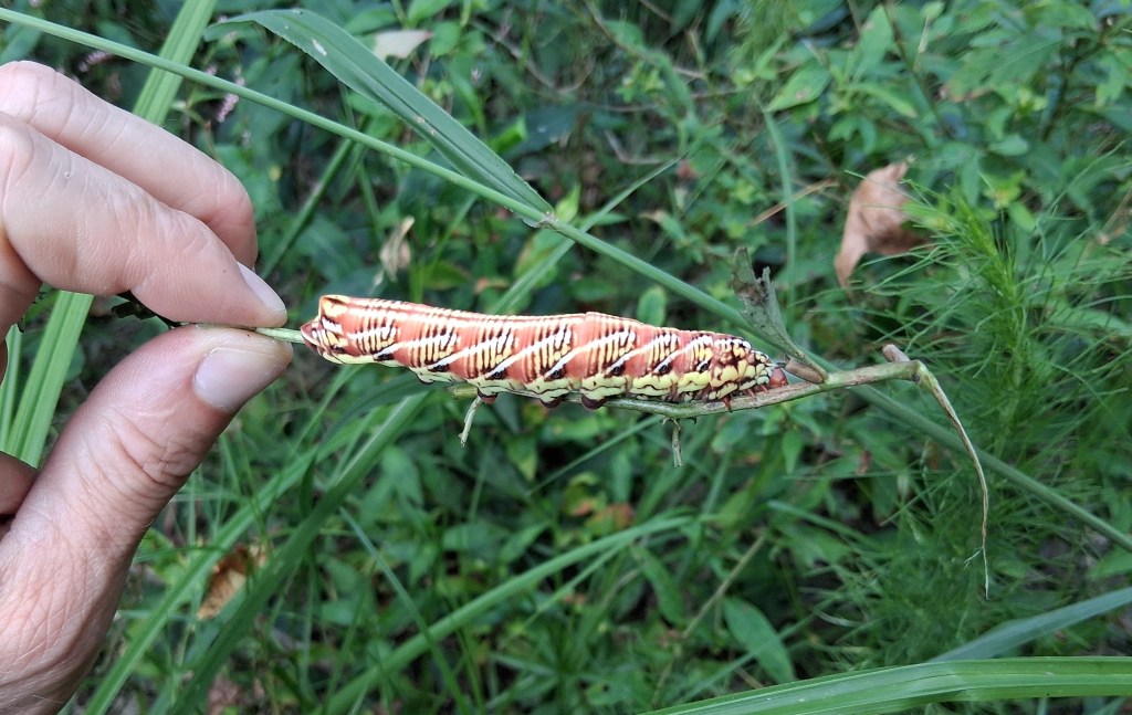 This is the caterpillar of the banded sphinx moth, Eumorpha fasciatus. The banded sphinx moth is a close relative (in the same family, Sphingidae) as the tomato and tobacco hornworms and catalpa worms. The earlier larval stages have a prominent horn, like other hornworms, but the horn is greatly reduced or missing from later stages, as pictured above. Larvae coloration varies with differing proportions of green, yellow, pink, red, orange, white, and black. Banded sphinx moths’ host range includes primrose, grape, Virginia creeper, and magnolia. Read more about the banded sphinx moth here.