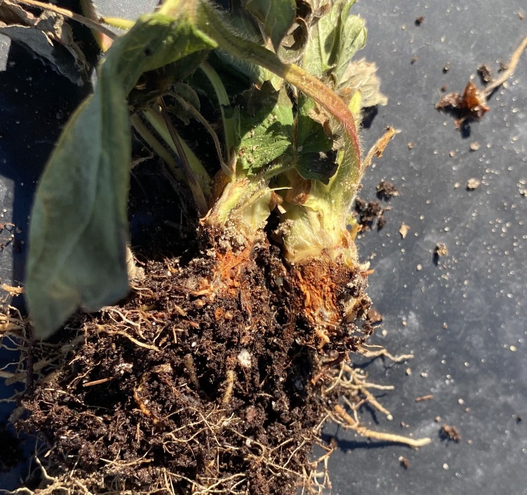 - Strawberries are progressing well overall in the Pee Dee. Initially, it seemed like cut-offs were a little behind on getting established, but they have since started to put on new roots and leaves. I have had one confirmed anthracnose crown rot diagnosis in the San Andreas variety, but other than that, disease pressure is low. The anthracnose crown rot is causing plants to collapse in the field. When the crowns are cut open, you can see the discoloration in the crown. Captan and Topsin M are both effective against this disease. As always, remember to rotate MOA to prevent fungicide resistance! The cooler weather has kept insects like spider mites and aphids away, so insect pressure is low currently.