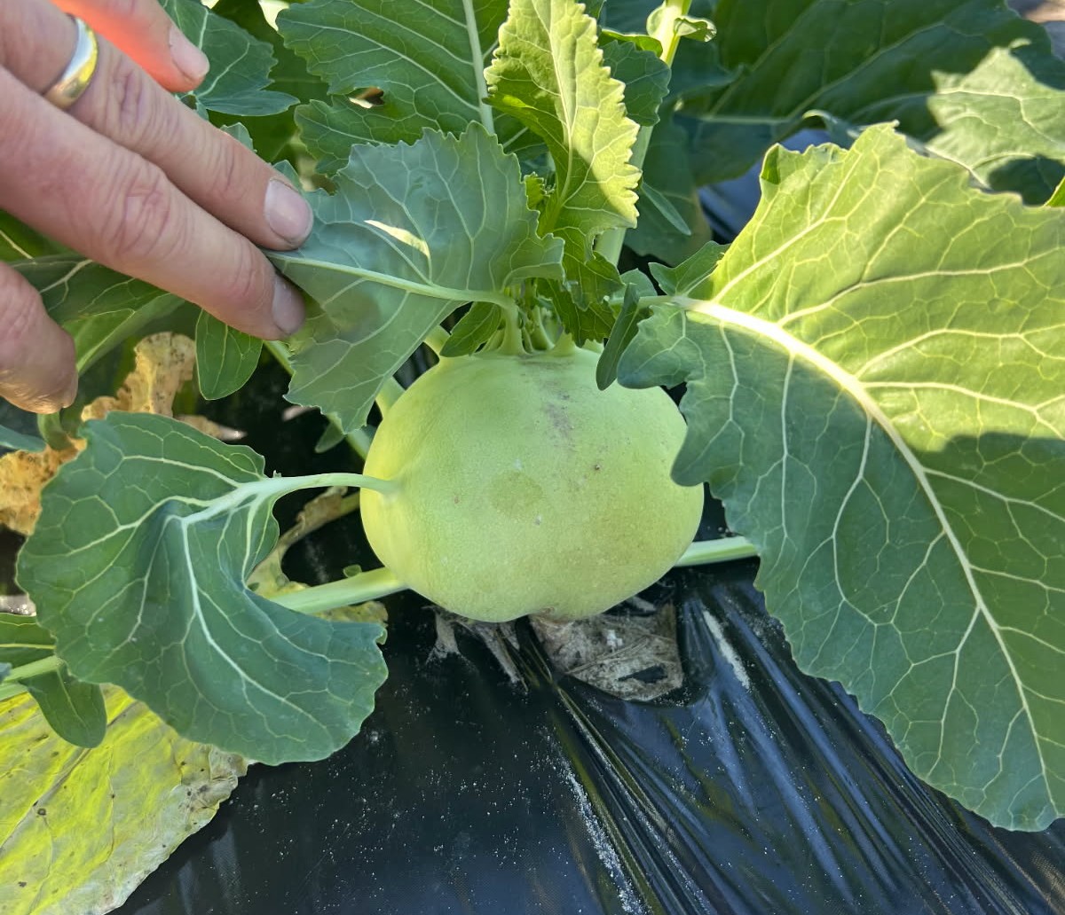This is neither a tumor nor a collard plant. This is kohlrabi. Kohlrabi is a close relative of collards and cabbage. In SC, it is best grown in the spring or fall, just as you would grow broccoli or cabbage. The enlarged bulb-like stem has a taste that is similar to cabbage and turnips, though slightly sweeter. Kohlrabi should be harvested when the stem reaches 2-3 inched in width. If it gets much larger, it will become tough and woody. Prepare the stem as you would turnips or radishes. The leaves can be eaten as well, though they may have a stronger taste than collard or kale leaves.