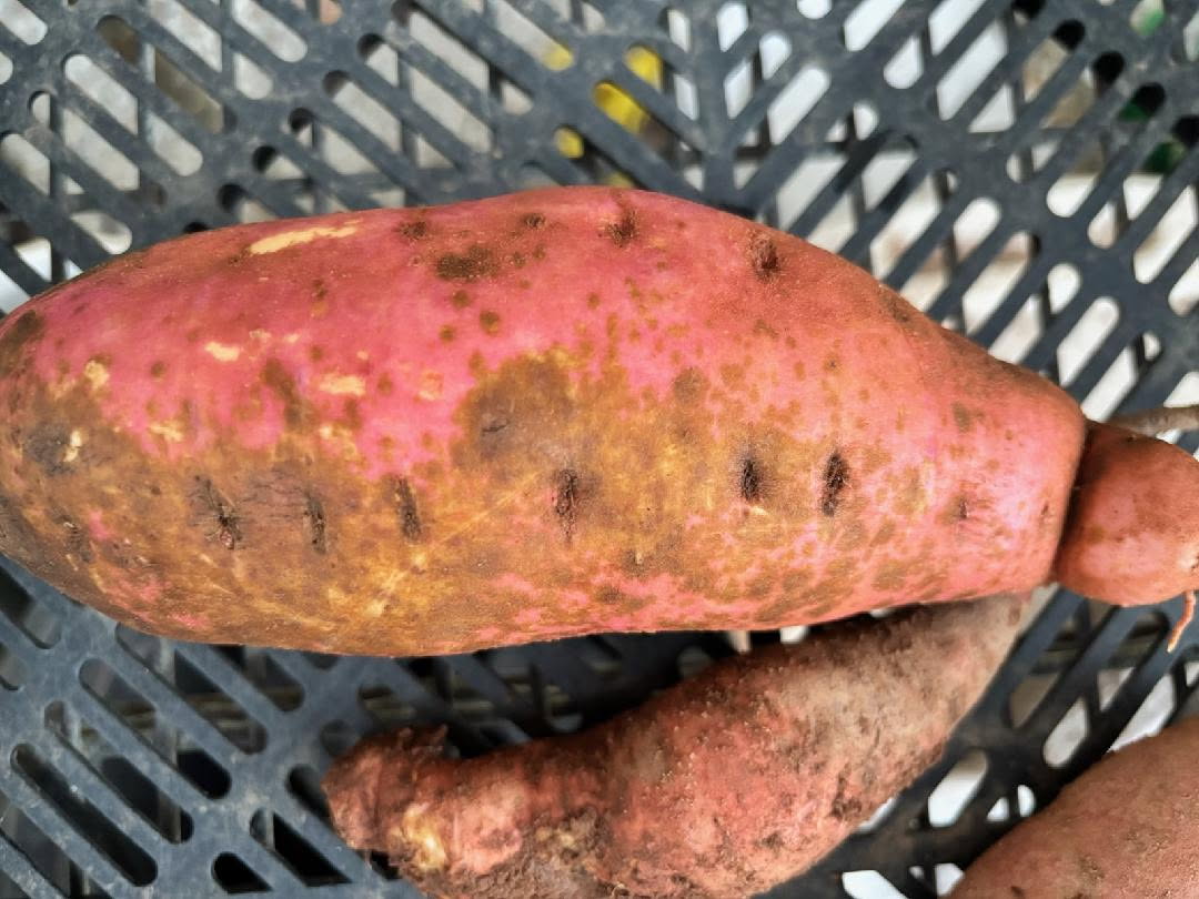 This sweetpotato has a superficial disease known as scurf (Monilochaetes infuscans). Scurf develops on the skin of the sweetpotato and is not visible on the flesh after peeling the skin. Though infected sweetpotatoes are still perfectly edible, this cosmetic defect renders them unmarketable. Scurf development is favored by high moisture and humidity, and symptoms can appear both in the soil and in storage. To manage scurf, plant sweetpotatoes in a site where they haven’t been grown in at least three years, use certified seed for producing slips, and clean harvesting and storage equipment carefully. Several fungicides are also labeled for scurf management. Read more about scurf here.