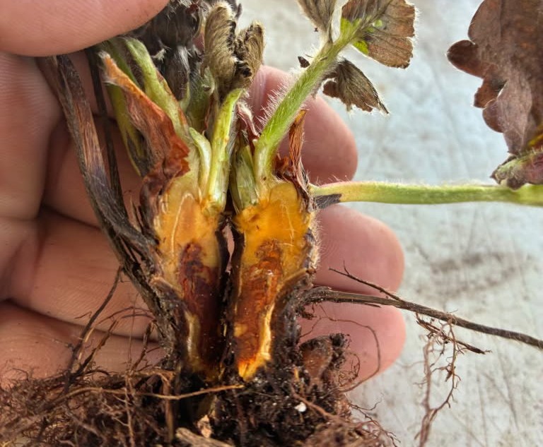 - We have had neopest root rot, phytophthora root rot, and anthracnose root rot. All three root rots have different management strategies, so please send samples into the lab for a positive diagnosis so we can treat with the appropriate pesticide. Lately, I have seen plants going down due to root and crown rots, so get out into your fields and look for symptoms of disease. The first thing I look for is a bronzing or purpling of individual plants or groups of plants. This lets me know that something is going on. Next, I cut the crown open to look for discoloration.